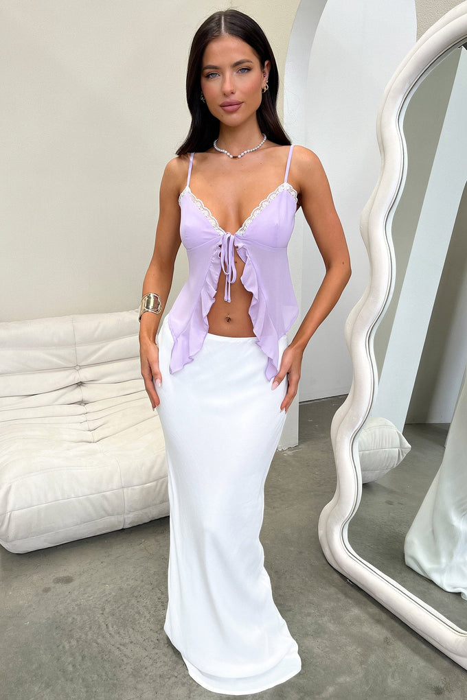 The Bridget Top is your new go-to for a playful summer look! Featuring a flowy fit, adjustable straps, and lined busts, this top also has lace trimming and a tie up front for added charm. Pair her with a mini skirt and heels for a fun night out!