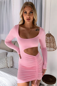 Watch out babes, this new lil baddie is about to blow you away! The Brynn Dress features a cheeky cut out detail at the waist, a wide round neckline, long sleeves and a ruching detail down the left side of the dress. Pair this babe with white heels, a high pony and a white shoulder bag for a cute barbie doll feel.