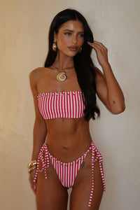 This playful strapless bandeau bikini top features a stripe print and delicate eyelet detailing around the neckline! Self-lined for comfort and support, it’s perfect for mixing and matching to create your ideal summer look. Pair it with denim shorts, sandals, and sunglasses for a fun day at the beach!