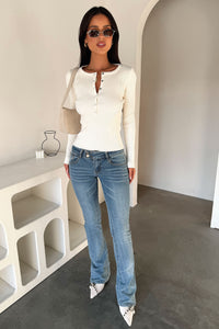 Stay effortlessly stylish and cozy this winter with the Demetria Long Sleeve Top! Made from a stretchy ribbed fabric, this top features a round neckline and a snap button closure on the front. Pair it with jeans and sneakers for a casual yet chic look. A must-have for your winter wardrobe!