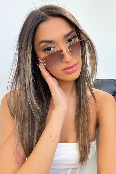 She's giving fun and chic! The Essex Sunglasses offer a brown gradient lens, no bordering frame and gold/ black hands. Match her with your go to fit this summer.