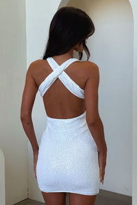 She's a guaranteed show stopper! The Evanka Dress features an all over sequin covered material with double lining, a backless cut with criss cross shoulder straps and a shaping bodycon fit. Style this gorgeous darl with stiletto heels and silver accessories for a full on glam night.