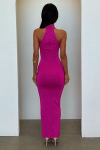 The Maxi of your dreams! She offers a soft double lined material, a high halter neck with a sleeveless cut, a cut out detail between the bust, a bodycon fit and an invisible back zipper. Style this goddess with white heels and gold jewellery for a stunning cocktail fit.