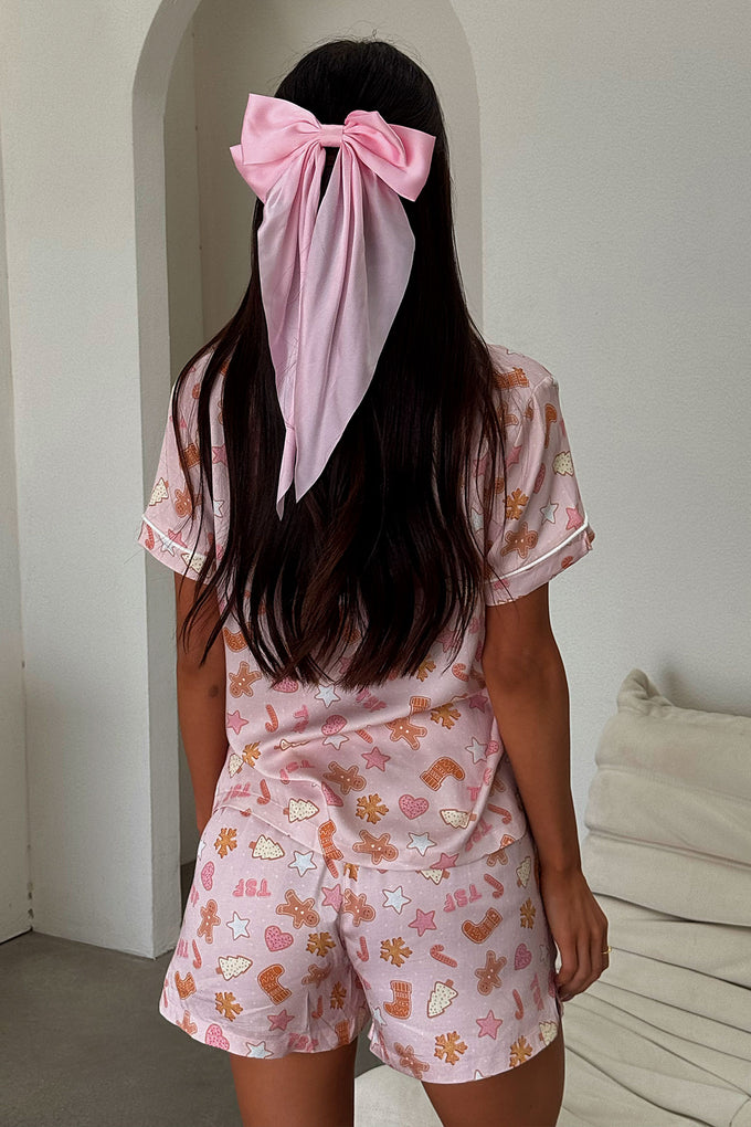 Get ready to cozy up in style with our Gingy Top in Pink! Featuring a playful gingerbread and Christmas print, this short sleeve pyjama top is perfect for a cozy bed time look. Made with soft material and a button up closure, pair it with our Gingy shorts and slippers for ultimate comfort!