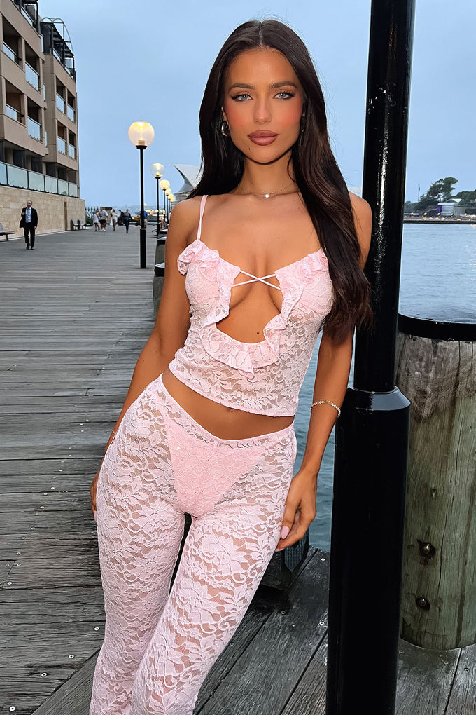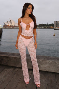 Elevate your style with our Jada Pants! Featuring a unique flower lace detail, flare fit, and mid rise, these pants will add a touch of elegance to any outfit. The rhinestone detailing and cut outs on the hips add a playful twist to these pants. Complete the look with our Jada Top and heels for a chic and fun night out!