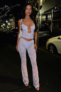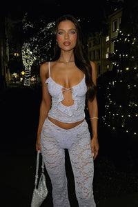 Unleash your wild side with our Jada Top. This lace top features thin adjustable straps and delicate rhinestone detailing, perfect for a night out. The floral lace and front/back cut outs add a touch of playfulness. Don't forget to pair it with our Jada Pants and heels for a complete look!