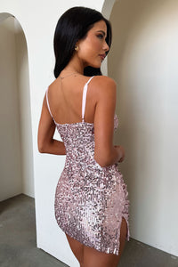 Get ready to shine in the Kelera Mini Dress! This bodycon mini dress features a v neckline, thin adjustable shoulder straps, and a small side split for a flattering fit. The eye-catching sequin adds a touch of glamour, perfect for any special occasion. Complete the look with white heels and a cute bag for an unforgettable outfit!