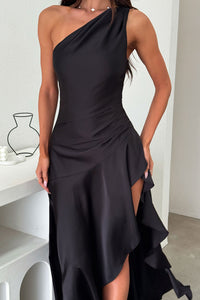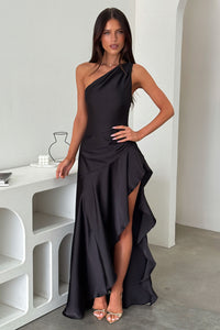 Slip into effortless elegance with the Leni One Shoulder Satin Maxi Dress! This showstopper features satin fabric with a chic one-shoulder silhouette anchored by an adjustable strap for the perfect fit. The lined bodice with mesh and invisible back zip provides support, while strategic waist ruching flatters your figure. A flowy frilled skirt and daring side leg split keep things fun and flirty. Dress it up with your go-to heels and gold jewellery for an unforgettable formal moment!