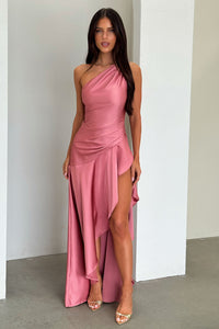 Slip into effortless elegance with the Leni One Shoulder Satin Maxi Dress! This showstopper features satin fabric with a chic one-shoulder silhouette anchored by an adjustable strap for the perfect fit. The lined bodice with mesh and invisible back zip provides support, while strategic waist ruching flatters your figure. A flowy frilled skirt and daring side leg split keep things fun and flirty. Dress it up with your go-to heels and gold jewellery for an unforgettable formal moment!
