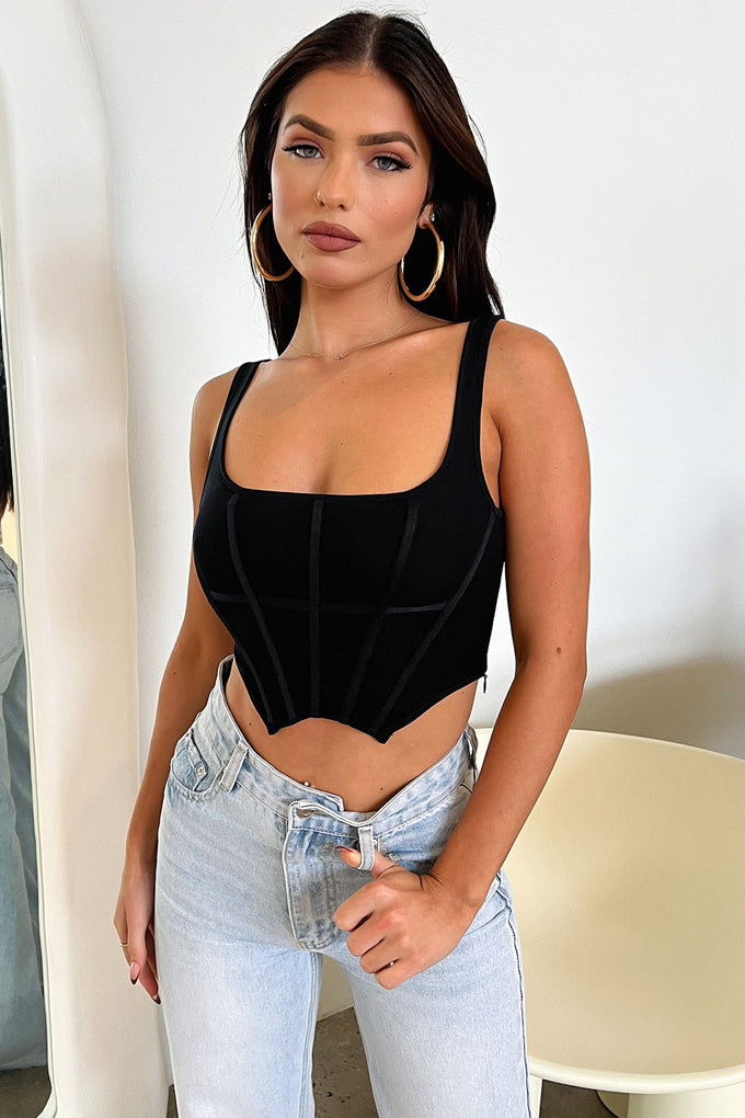 Cute top and jeans kinda vibe! The Luca bustier features boning details down the front, double lining with a mesh top layer and an invisible side zipper. Match her with Blue Denim Jeans and white sneakers for a cool and easy look.