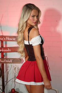 This playful Little Red 2 Piece Set features a mini dress with a PU leather torso and front lace-up detail, a stretchy neckline, adjustable shoulder straps, and a charming bow accent. The layered skirt adds a flirty touch, finished with an invisible back zip for easy wear. Completing the look is a matching satin cape with a hood and thin neck tie, perfect for adding a whimsical flair. Pair with matching accessories to create an irresistibly cute costume that’s ready for any adventure!