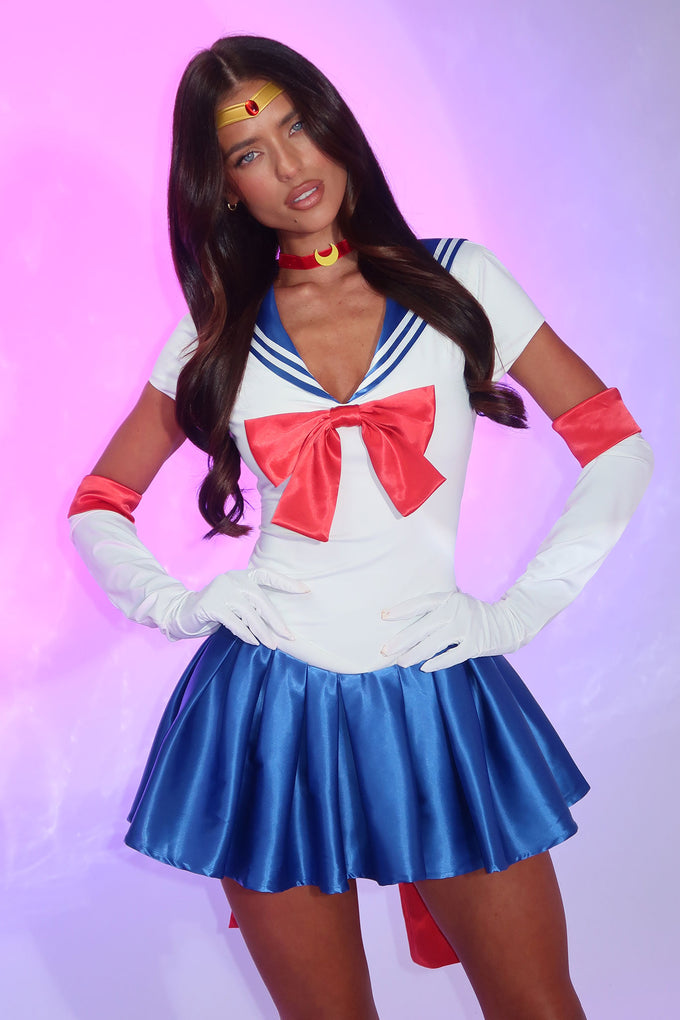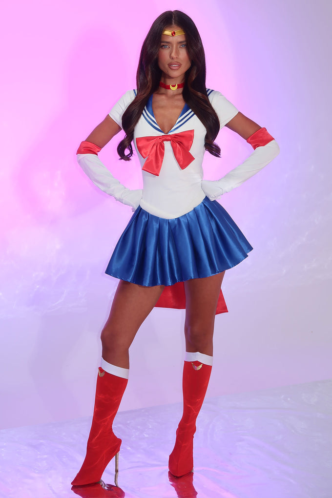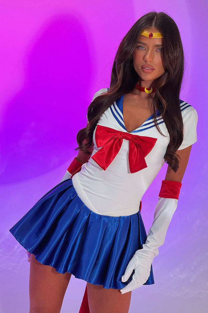 This playful two-piece set features a soft mini dress with a sailor-style collar and a charming bow on the front! The double-lined design ensures comfort, while the open back adds a flirty touch. A pleated skirt flows effortlessly, complemented by a big detachable red bow, an invisible back zip and a snap button bodysuit inside for a perfect fit. This set also includes white and red elbow length gloves made with soft stretchy fabric. Complete your look by pairing it with matching accessories and boots for a fun, stylish vibe!