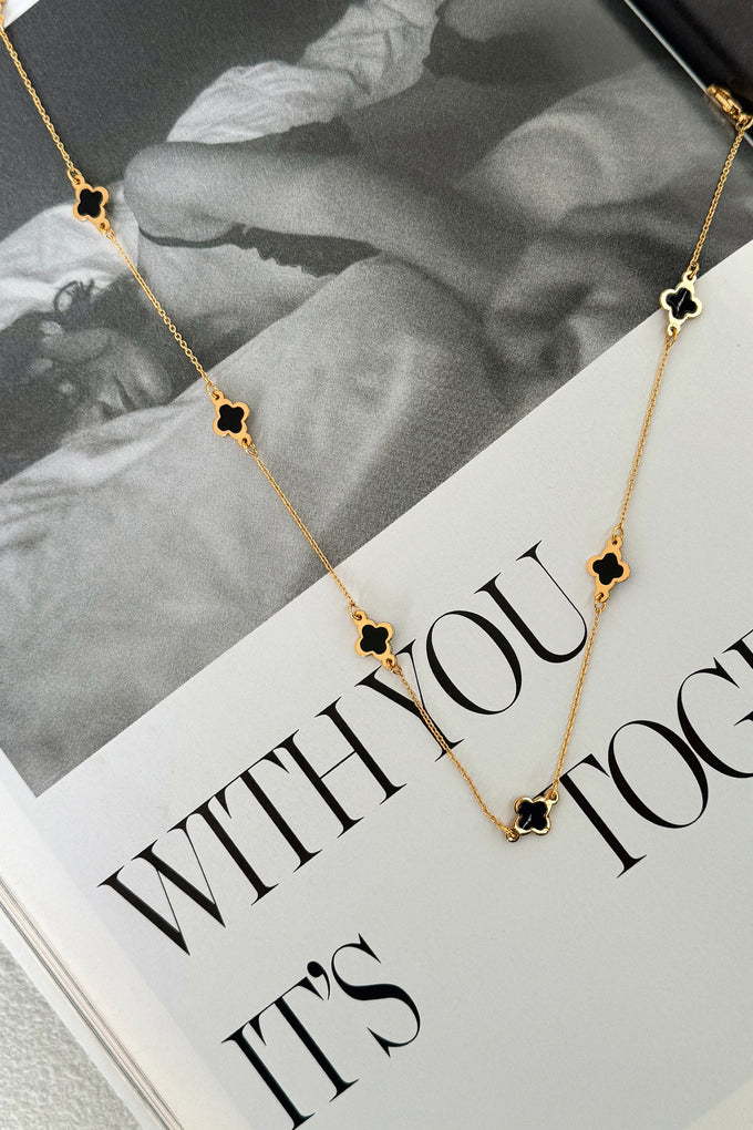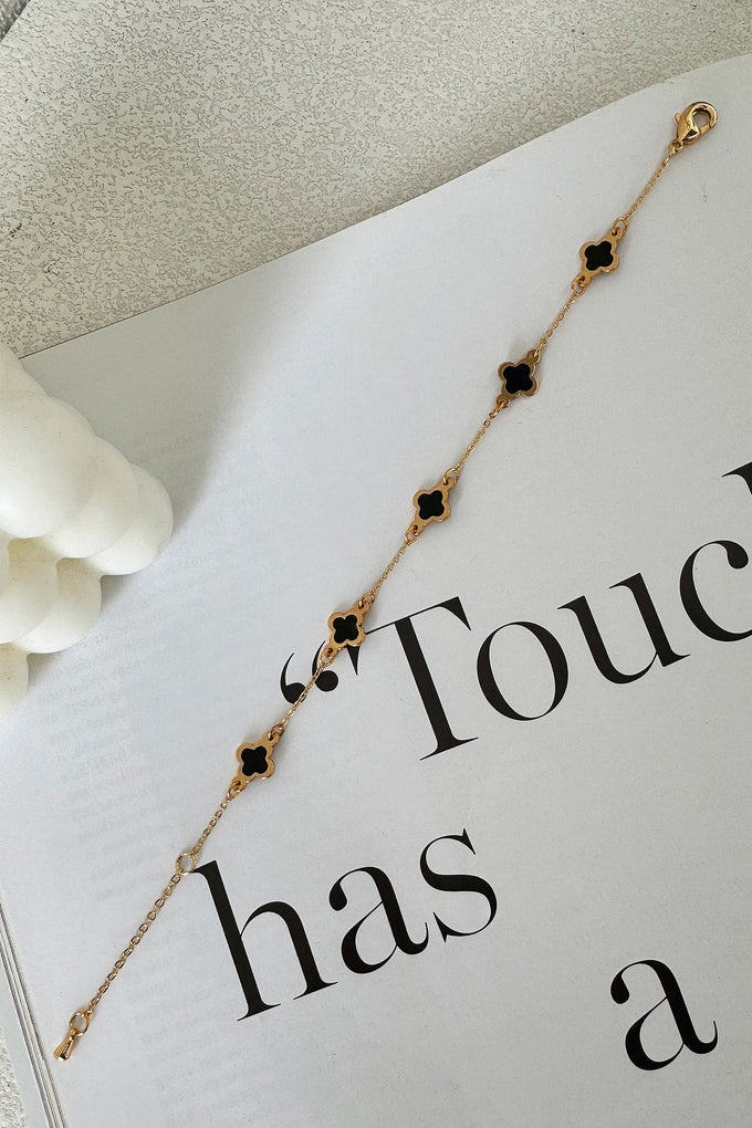 This Oriana Bracelet in gold and black features a playful clover design and an adjustable length for the perfect fit. Pair it with the matching necklace for a complete and stylish look!
