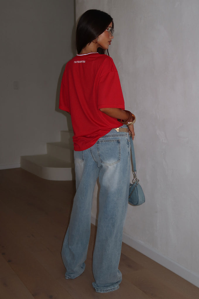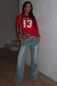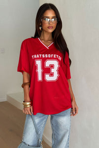 Score style points with this oversized jersey tee featuring a V-neck and bold number detail! The Thats So Fetch logo adds a sporty vibe, making it perfect to pair with sunglasses and denim shorts for a playful, varsity-inspired look!