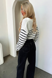 Introducing the Tinsley Cropped Knit - effortlessly chic and cozy. The classic black and white stripes add a touch of playfulness to this v-neck, collared knit. Perfectly paired with jeans and ugg boots for a laid-back, yet stylish look!