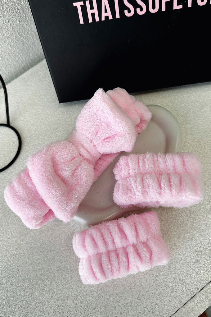 Elevate your beauty game with our TSF Headband and Wristband Set in Pink! Made from soft and fluffy material, these elasticated accessories will keep your hair under control while you slay your makeup looks. Plus, the headband's cute bow adds an extra touch of charm. A must-have for every makeup guru!