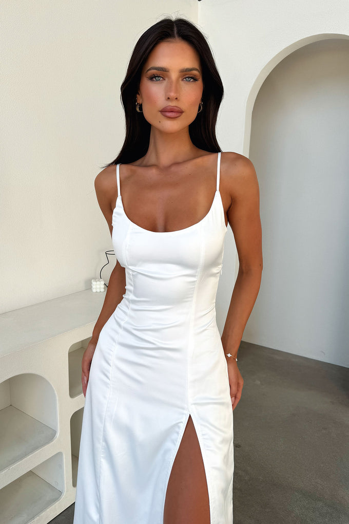 Dress to impress in our Violetta Scoop Neck Satin Maxi Dress! Made with luxurious satin fabric and featuring a scoop front neckline, adjustable shoulder straps, and a back cut out, this dress is sure to turn heads. Fully lined and versatile, pair it with heels and gold jewellery for the perfect formal event look!